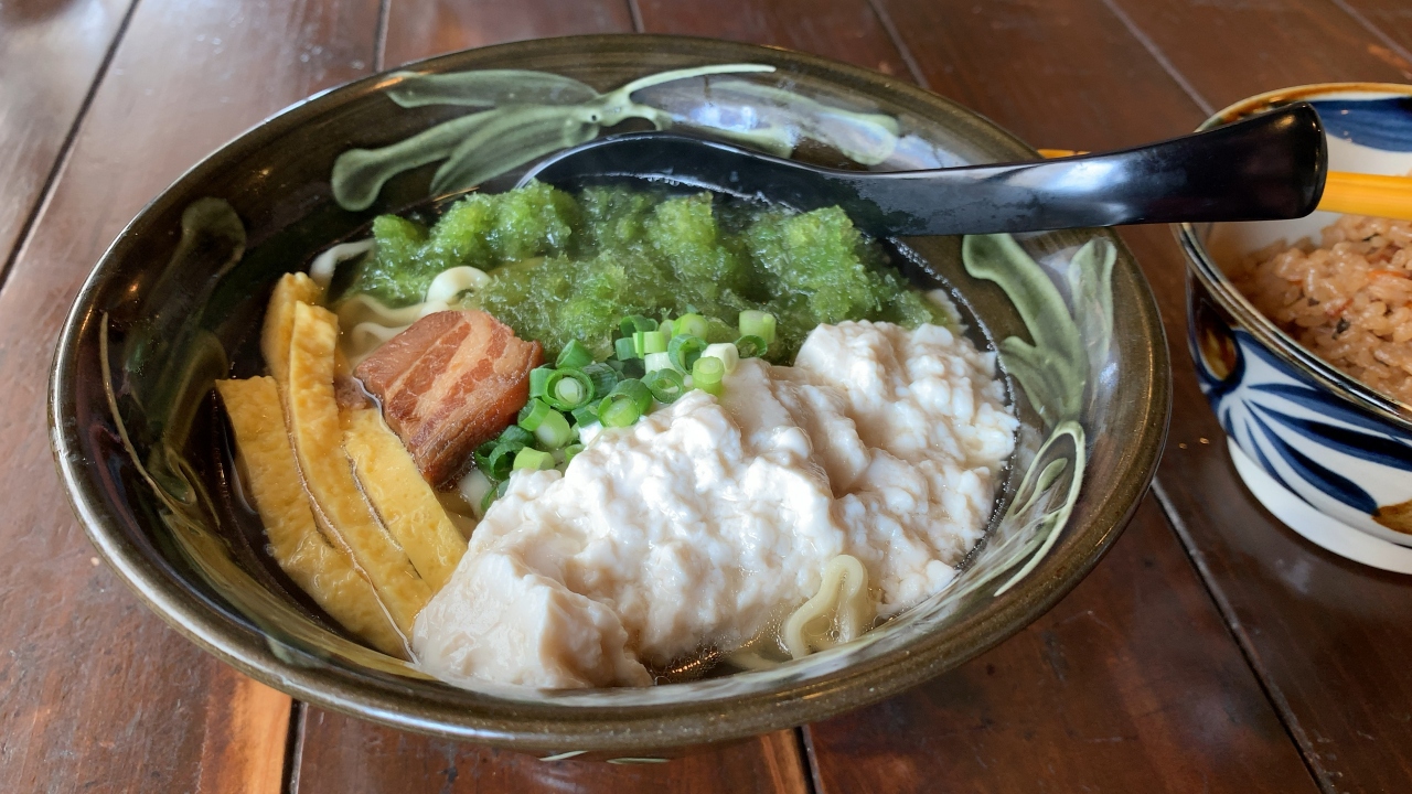 私が食べたのは、磯の香りがするアーサと美味しいゆし豆腐が入った沖縄そば。さーふーふーの店内はジャズが流れ、北中らしいお洒落さを感じます。店は中村家住宅のすぐ近く。中城城跡からもそれ程遠くないので、観光の後は美味しい沖縄そばを食べに行ってみましょう。
