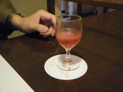 夕食です。食前酒。桜のカクテル。席まで来てくれて、シェイカーで作ってく...