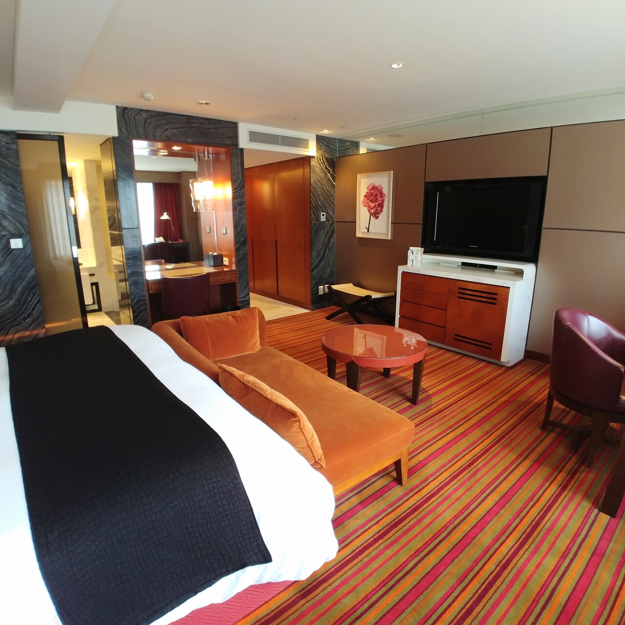 お部屋はかなり広くて、インテリアは高級感あふれる感じ。バスタブや洗面台が黒色なのが変わってます(汚れが目立って掃除が大変そうだけど)。夕食と朝食をインルームダイニングにしましたがどちらも美味しかったです。