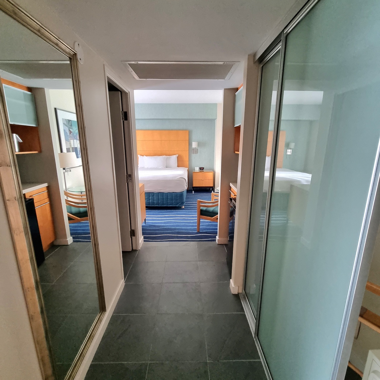 お部屋にキッチンや電子レンジがあり食器も常備されていたので、持ち帰った料理を食べたりする時に助かりました。ホテルの1階にスターバックスが入っているのも嬉しかったです。