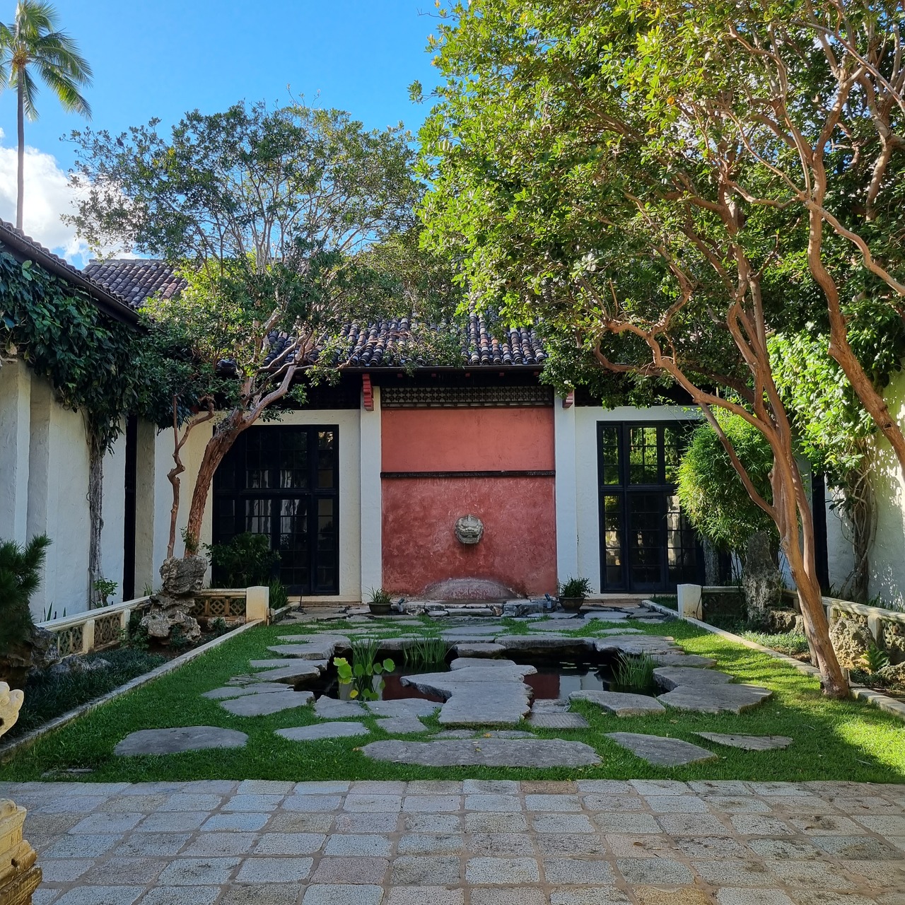 いくつかの中庭を囲むように展示室が配置されており、美術館内は結構広いです。入口で入館料20ドルを払うとシールを貰えるので、それを胸に貼って館内をまわります。写真はOKですが動画はNGと案内されました。ピンクのお花が綺麗な中央の中庭、中国式中庭、地中海式中庭のいずれも美しく、見応えありです。ハワイ現地の作品は思ったより多くなく、アジア各地やヨーロッパの作品が大半でした。お客さんはそんなに多くなかったので(特に、アジア美術の方はほぼ無人でした)、ゆっくり静かに作品を鑑賞できて良かったです。疲れたら、館内にある開放的なカフェで一休みすることもできます。