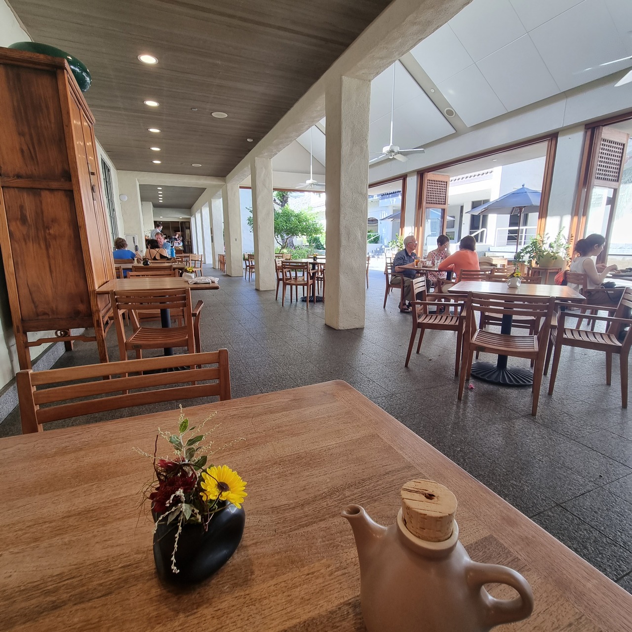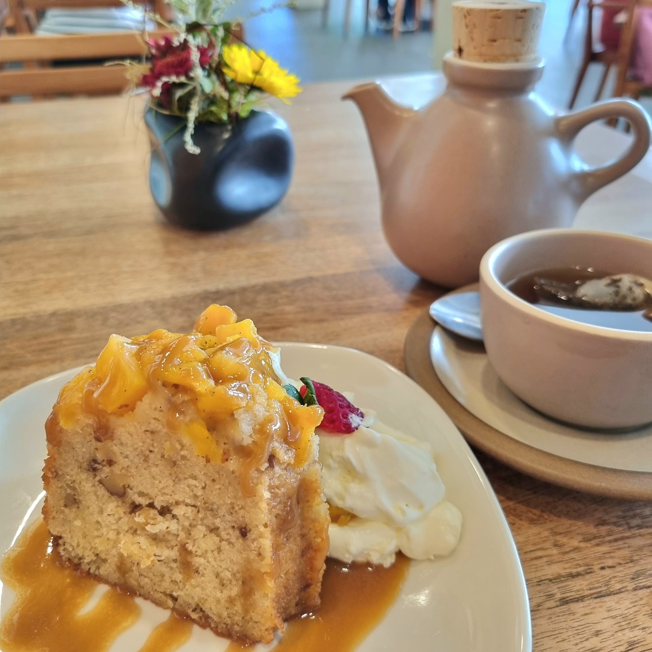 美術館の中にありますが、とても開放的で雰囲気の良いカフェです。美術館の中なので落ち着いた静かな雰囲気かと思いきや、皆でわいわいおしゃべりしている人が多かったです。席を飾り付けしてお誕生日会みたいなのをしているグループもいました。席は外のオープンな席と中の方の席があって、どっちが良いか聞いてくれました(内側の席を選択)。私は観覧中の休憩を兼ねて軽くケーキと紅茶をいただきましたが、食事メニューがメインのようです。紅茶はティーバックを自分で入れる方式で、ポットが可愛かったです。パイナップルケーキも美味でした^^