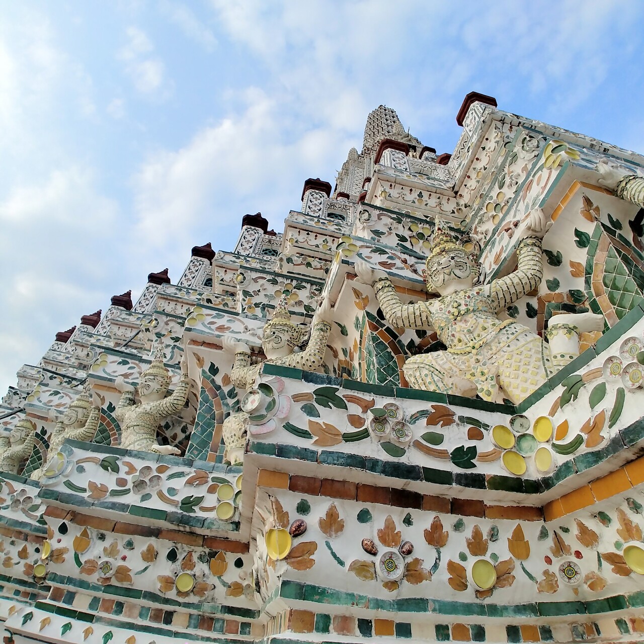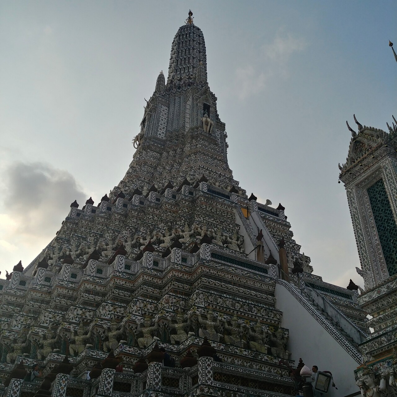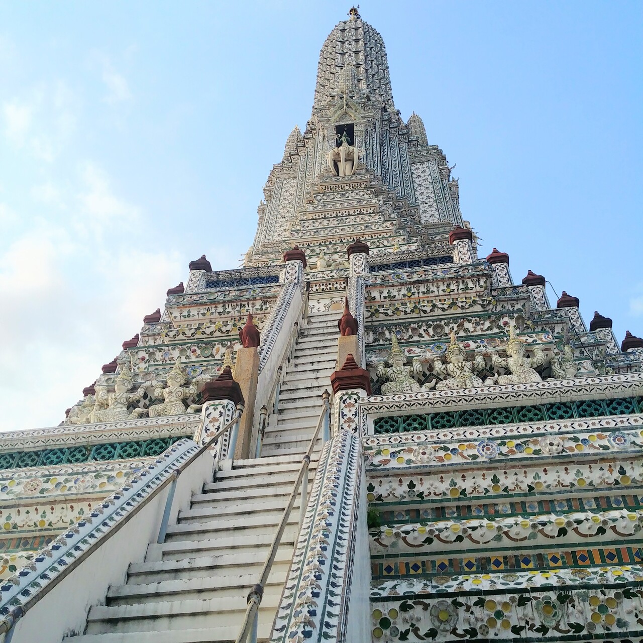 ワットポーの近くから舟で川を渡って行きました。舟から見える姿も美しかったです。近くで見ると、大きくて迫力が凄い。全面に施されている模様は、繊細で可愛い感じです。途中の部分まで階段で登れますが、かなり急なので注意が必要。しかも皆写真撮影に夢中なのでちょっと怖かったです。私は夕方に行き、暗くなるまでぼーっと眺めていました。ただ、ライトアップまでは待つことができなかったので、次は夜のワットアルンを見てみたいです。