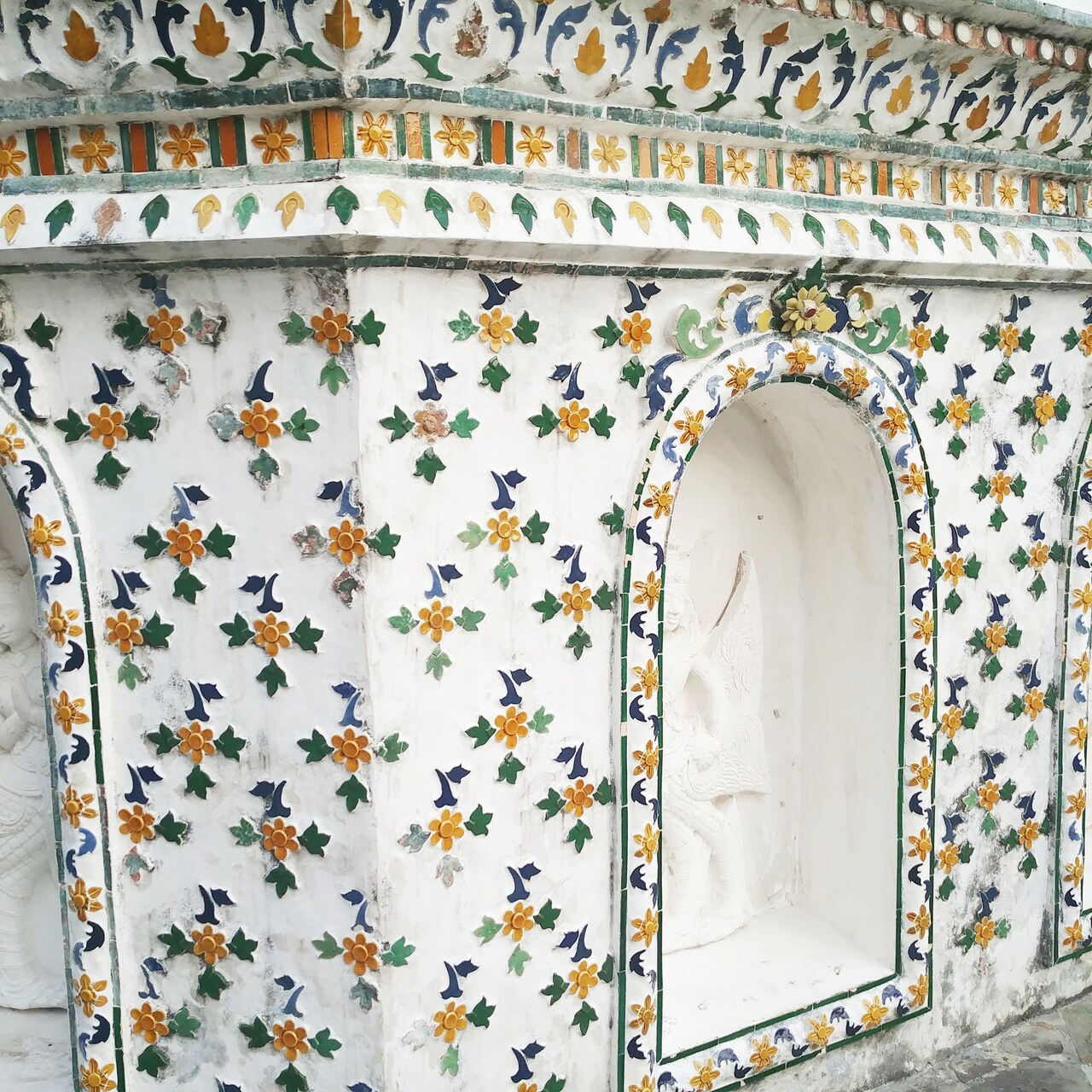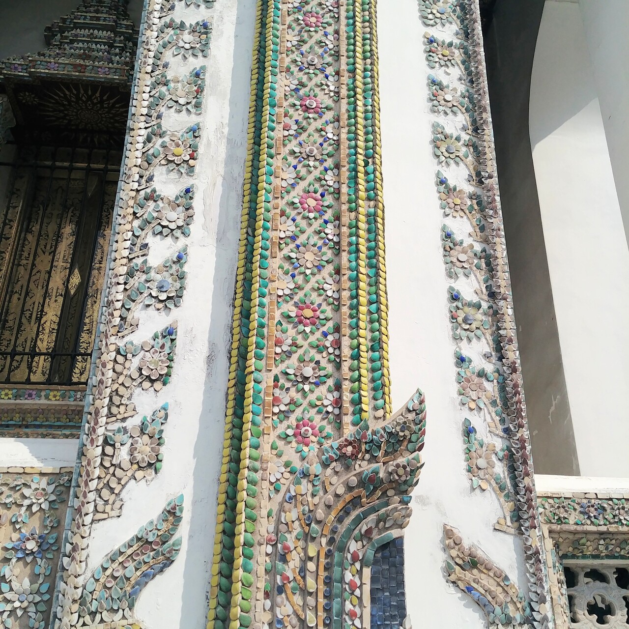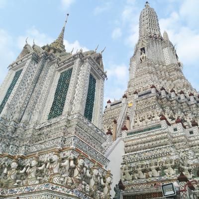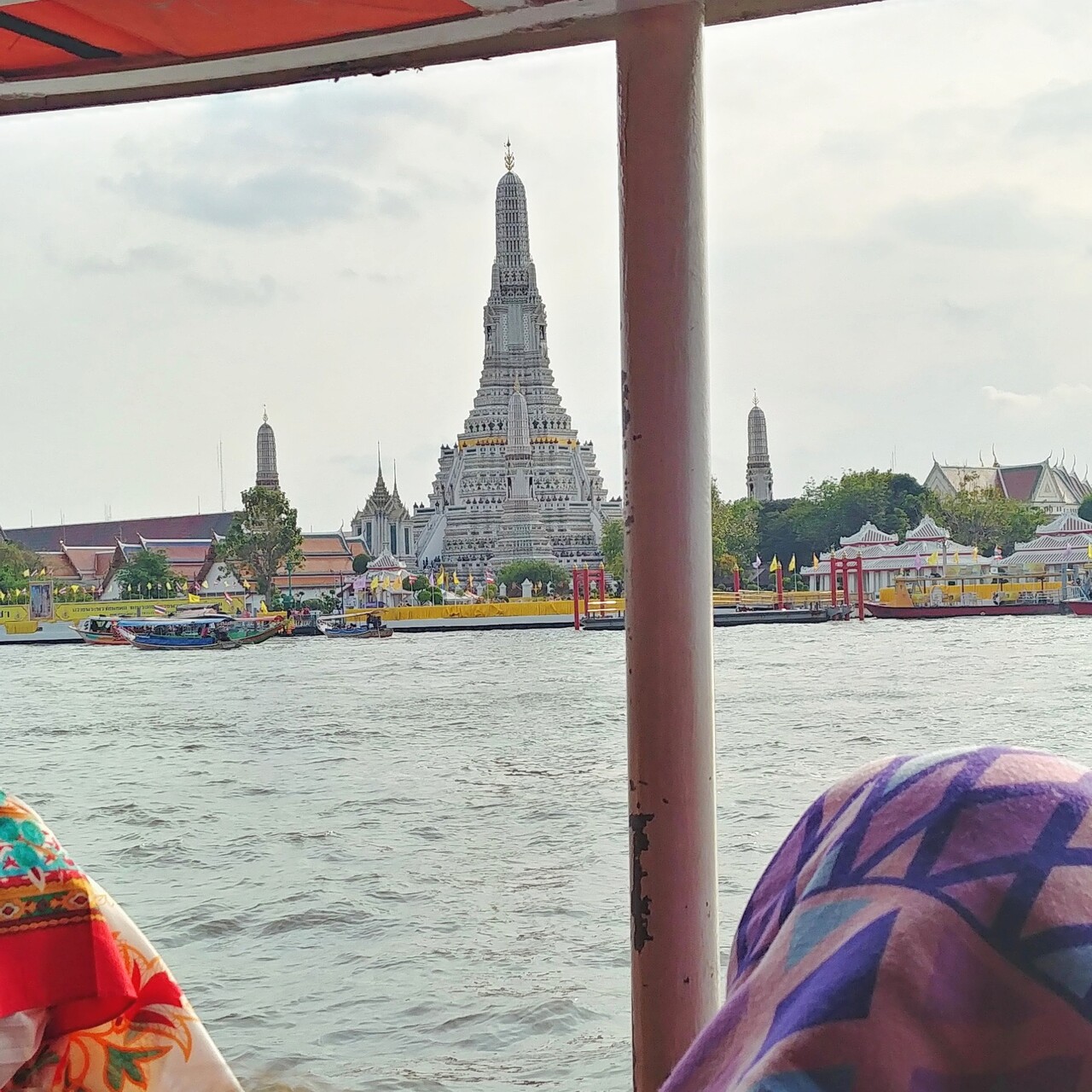 ワットポーの近くから舟で川を渡って行きました。舟から見える姿も美しかったです。近くで見ると、大きくて迫力が凄い。全面に施されている模様は、繊細で可愛い感じです。途中の部分まで階段で登れますが、かなり急なので注意が必要。しかも皆写真撮影に夢中なのでちょっと怖かったです。私は夕方に行き、暗くなるまでぼーっと眺めていました。ただ、ライトアップまでは待つことができなかったので、次は夜のワットアルンを見てみたいです。
