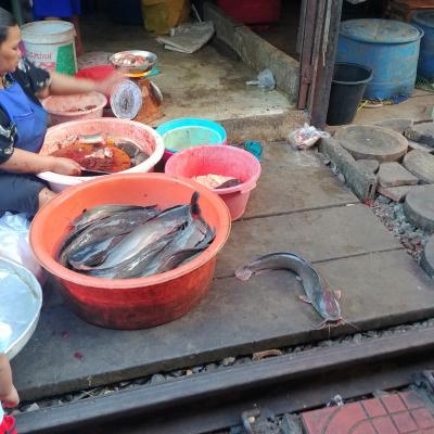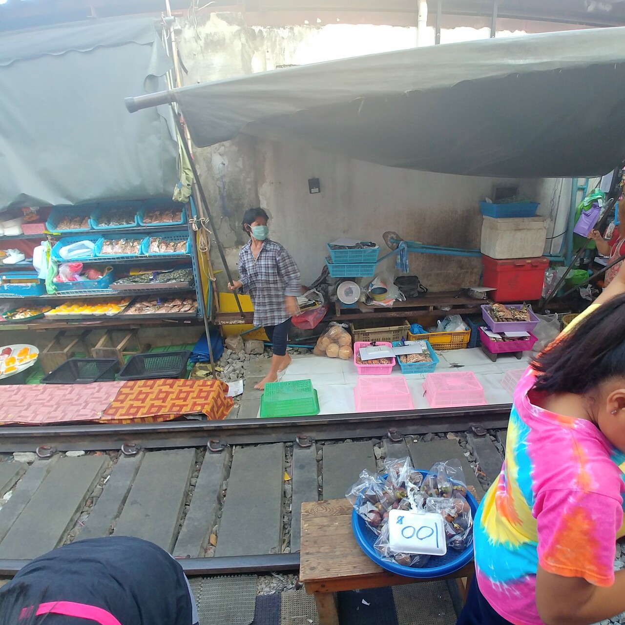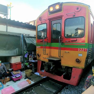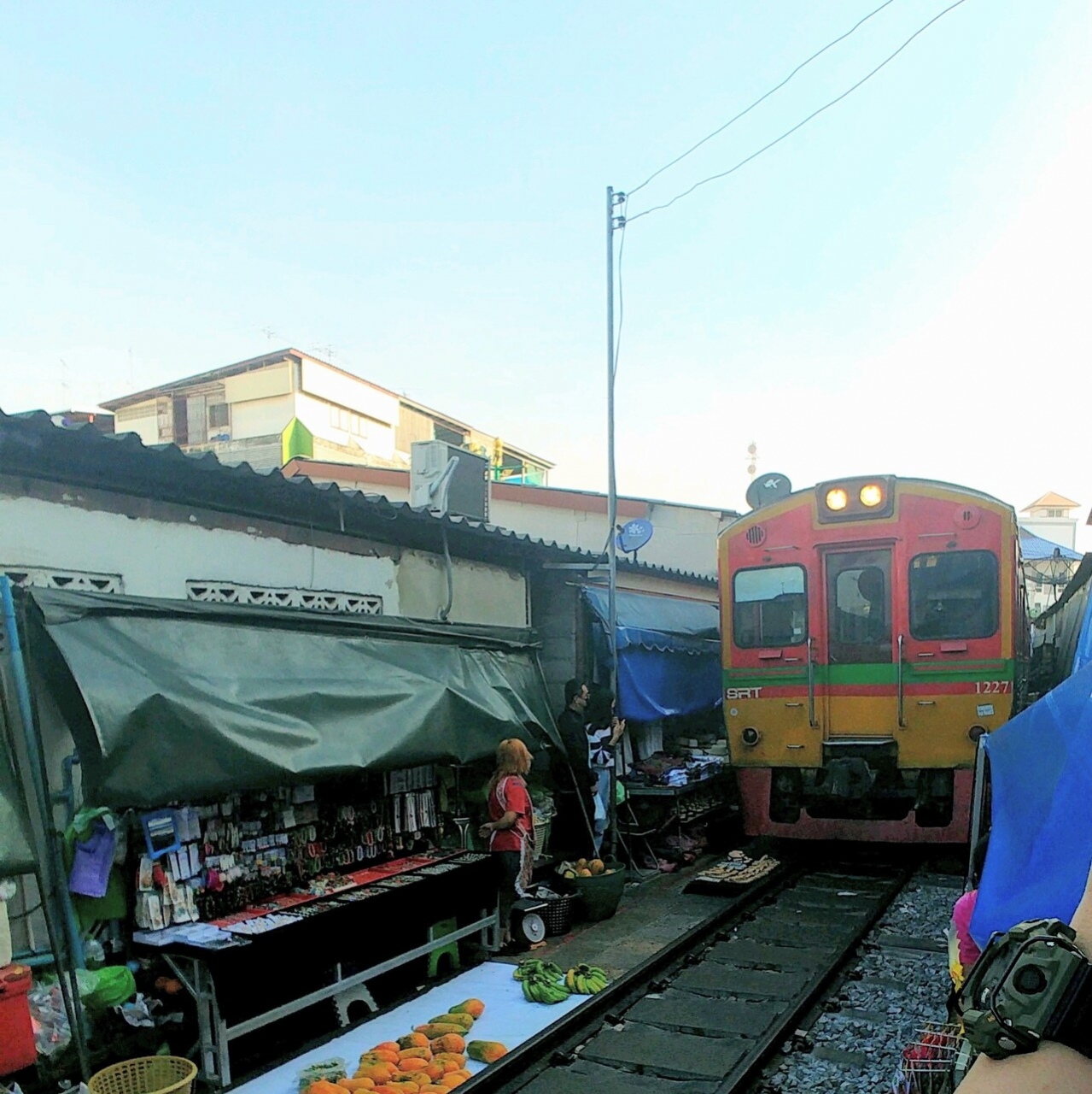 水上マーケットやアユタヤを回る1日ツアーの中で行きました。電車が来る前は、ほんとに普通の市場です。下が線路なので多少歩きづらいですが、散策が楽しいです。電車が来る5分くらい前になると大丈夫なのか不安になりましたが、あっという間に片付けられ、線路上にいたたくさんの人たちもどこかへ...。目の前を通過する大迫力の列車を見れて楽しかったです!こんな経験は滅多にできないと思います。列車が通った後、数秒で営業が開始されるのも、凄いなと思いました^^