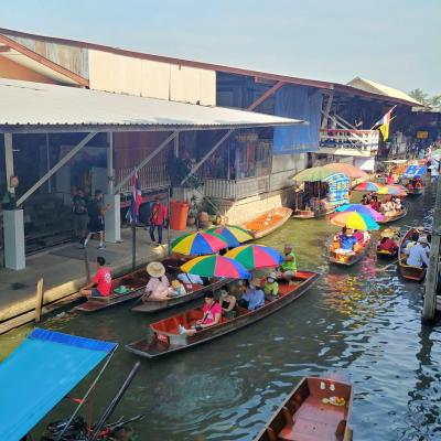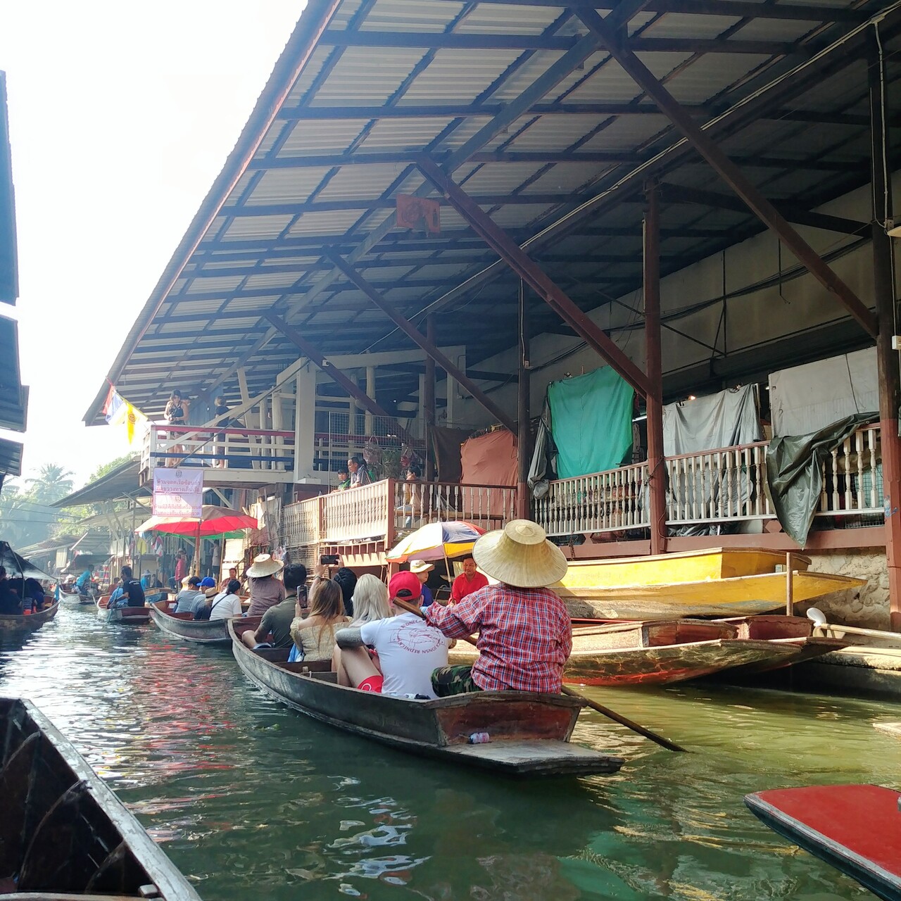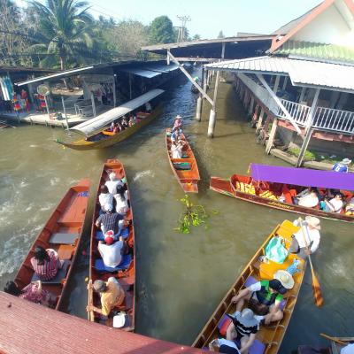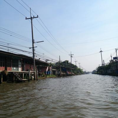 メークロン線路市場やアユタヤをまわる1日ツアーの中で行きました。水上市場をのんびり巡る手漕ぎボートと、高床式の住宅街を疾走するモーターボートに乗りましたが、どちらも楽しかったです!市場では、舟に乗りながら食べ物やお土産などを買うことができます。見ているだけでも十分楽しめます。春節連休中かつ日曜の昼だったので観光客が多く、舟が渋滞していました(笑)モーターボートの方は、スリル満点でした!