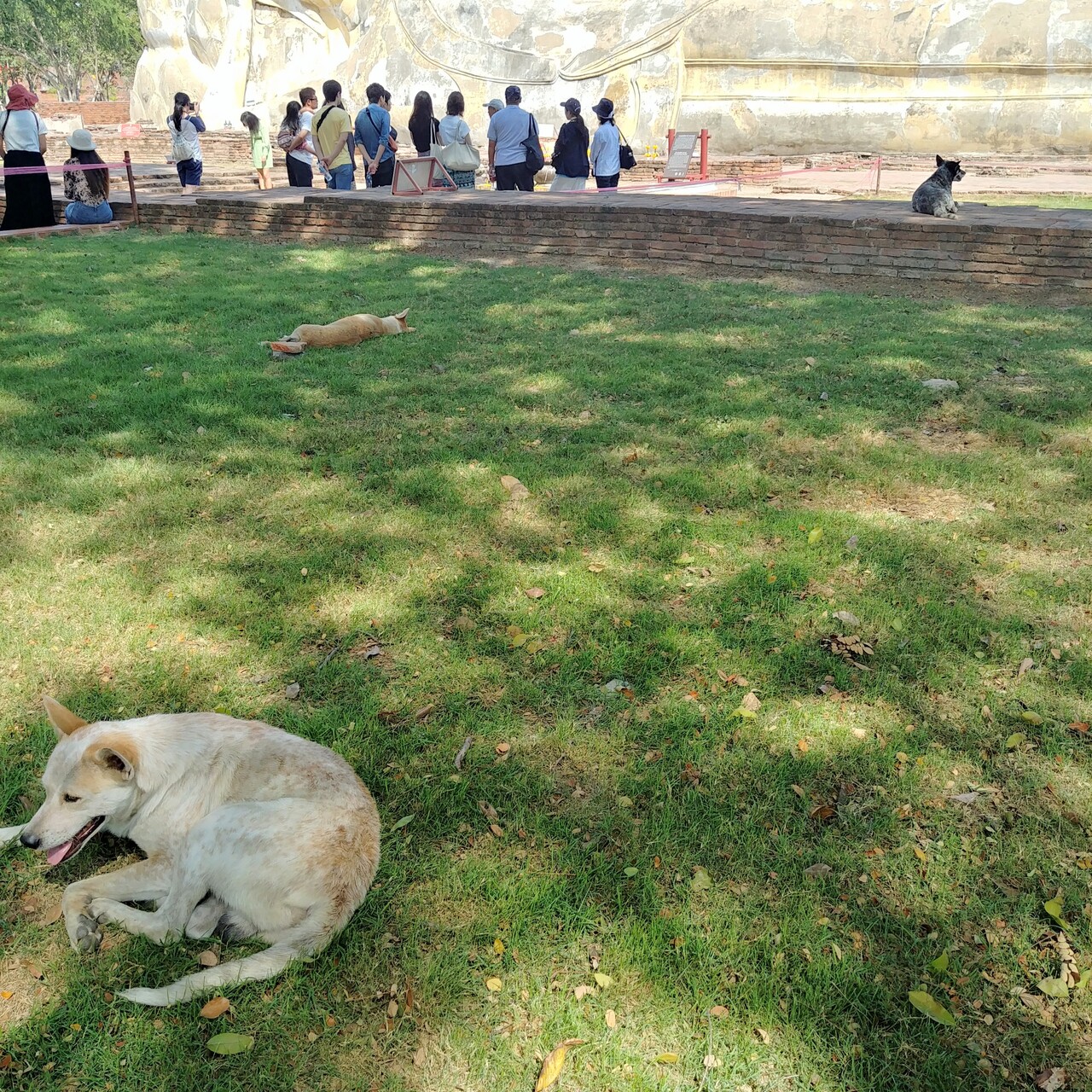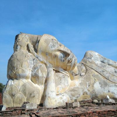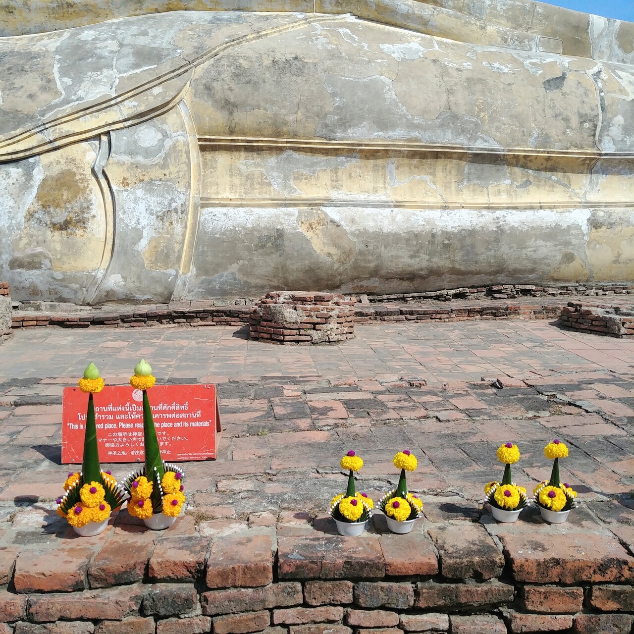 アユタヤの1日ツアーで行きました。蓮の花を枕にして横たわる寝釈迦仏。表情がとても穏やか。金ぴかの寝釈迦仏とはまた違った良さがあります。お供えされているお花が可愛かったです。寝釈迦仏の後ろの、かつて宮殿があった部分は、ビルマ軍に破壊されほとんど何も残っていません。野良犬がたくさんいましたが、のんびりお昼寝していて全然怖くなかったです。