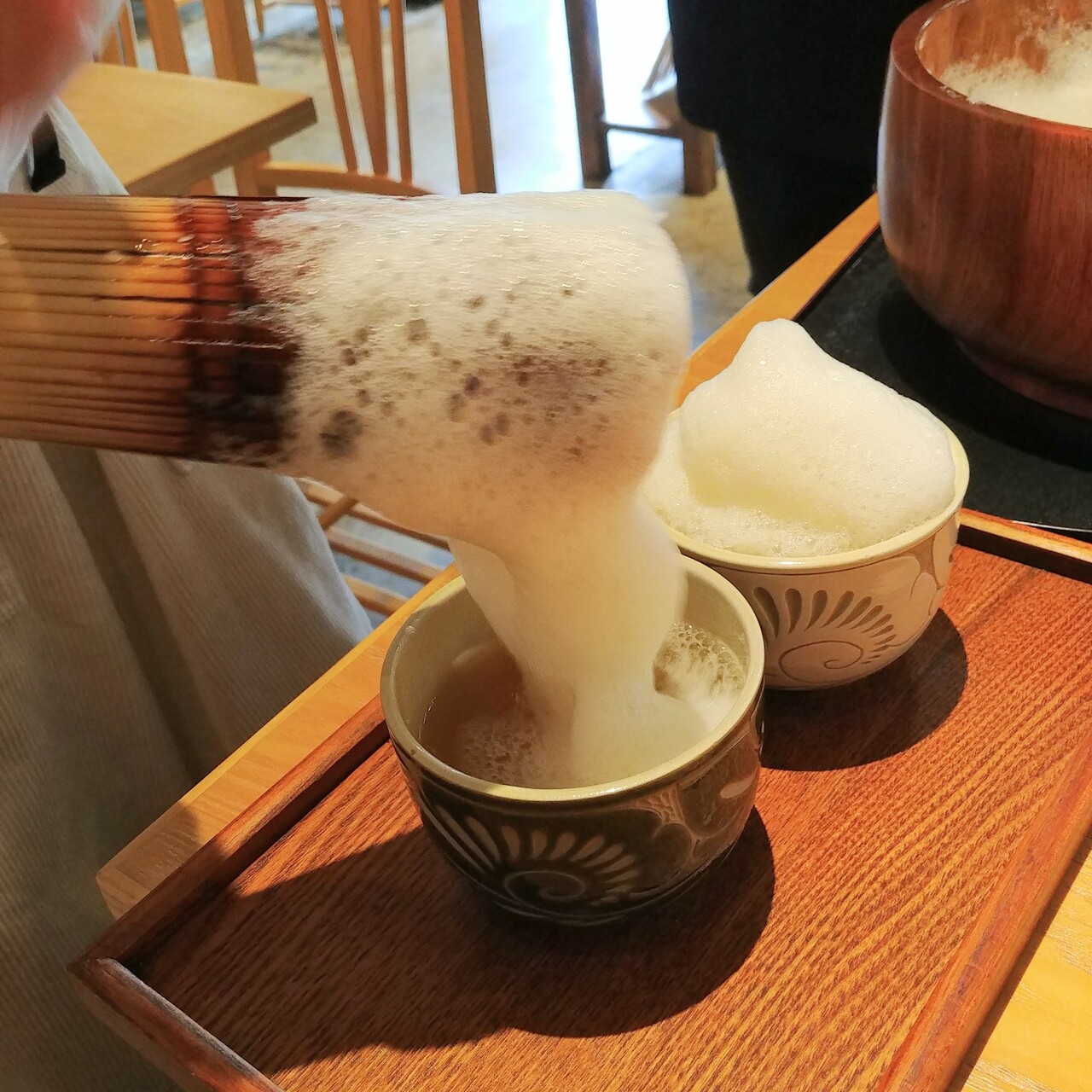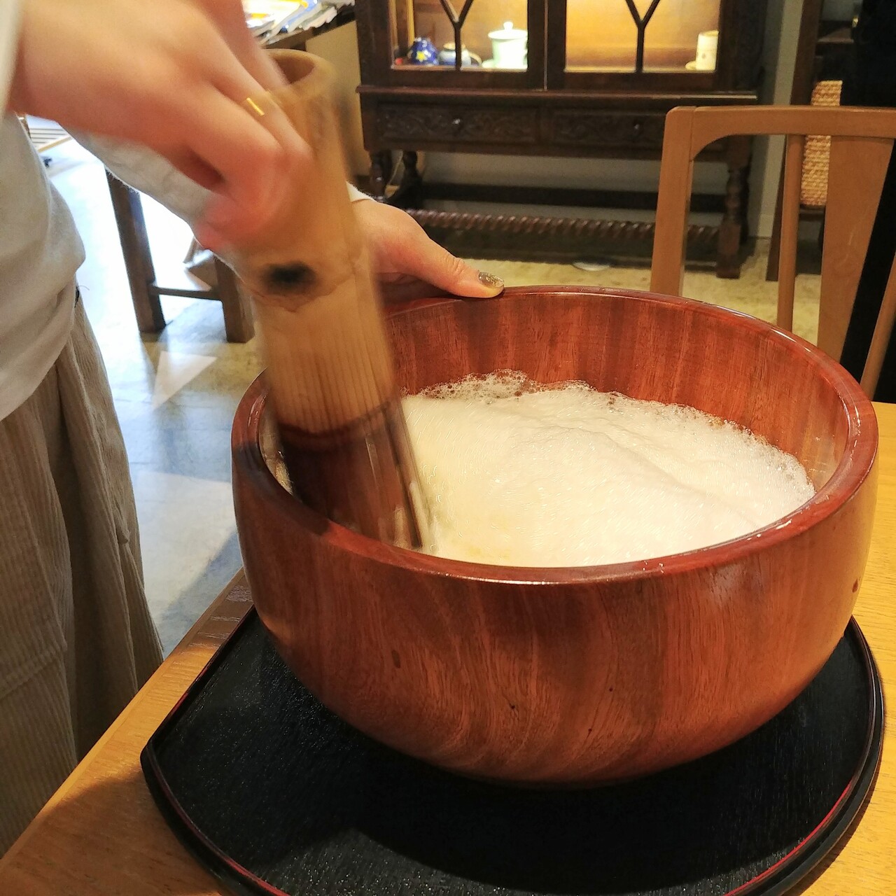 とても大きなお碗みたいなもので、ぶくぶくと泡をたて、できた泡をお茶にのっければ完成です。泡をたてるのは簡単そうに見えて難しく、先生がたてた泡がやっぱり一番綺麗でした。お茶はホットだけかと思ったら、冷たいお茶も選べました。味は玄米茶みたいな感じです。泡と一緒に飲むのは難しい...^^;セットのお菓子もどれも美味しかったです!