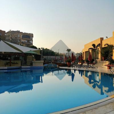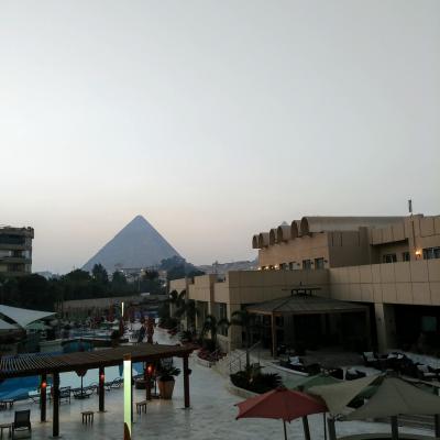 ギザのピラミッドの横にあるホテル。ピラミッドビューの部屋があります。私は2階だったので、ピラミッドは一つだけ見れましたが、上の階だと二つ並んで見えるようです。場所も奥まっていてベランダなしだったので、たぶんこのホテルでのピラミッドビューの中では一番良くない眺望の部屋と思われます。それでも、部屋からピラミッドが見えるという非日常さには感動しました!