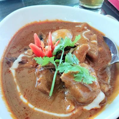 マッサマンが食べたくて、一人でランチに行ってきました。BTSトンロー駅から歩いて15分くらい。周辺は閑静な住宅街です。お店はすごくお洒落! お昼をだいぶ過ぎた時間だったのであまりお客さんはいませんでした。一人で来ている人も何人かいて、心強かったです(笑) マッサマンはお肉の種類が選べて、ポークを選択。一人に丁度良い量でした!味はもちろん美味しい^^ 特にロティがサクサクで美味でした! 食後に勧めてくれたけど、デザートも豊富で美味しそうでした。