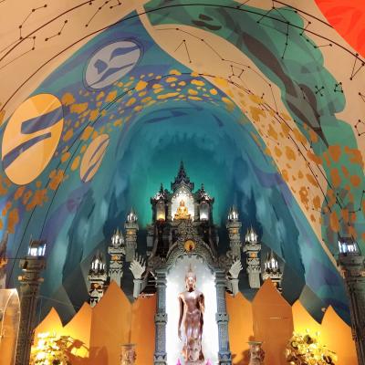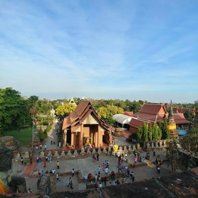 アユタヤの1日ツアーの中で行きました。入り口には寝釈迦仏があり、足の裏にコインを上手く挟めると良いらしい...。本堂の横にも大きな仏像があり、オレンジ色の服をお供えしながら祈っている人たちがたくさんいました。本堂は上ることができ、テラスからの眺めは素晴らしいです。