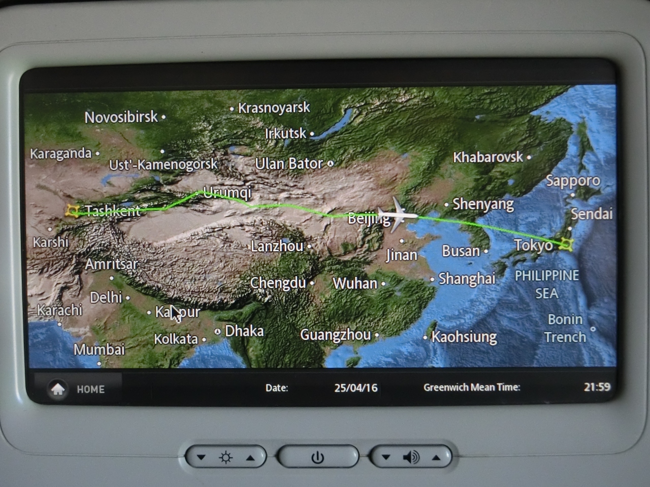 飛ぶルートはほぼ真西、富士山、金沢、朝鮮半島、北京、Baotou、