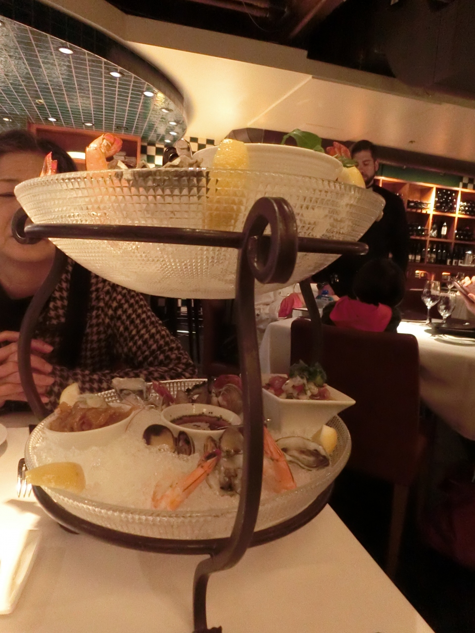 2段のシーフードタワーは、C$78、ビール7ドルとタックスを加えて、