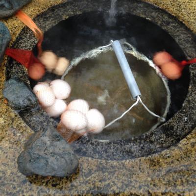 宿の案内で温泉卵が作れると言うので、スーパーで卵を買って、