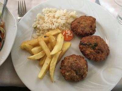 では、スープ、オムレツ、パン、ムサカ、フライドポテト、デザートです。