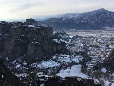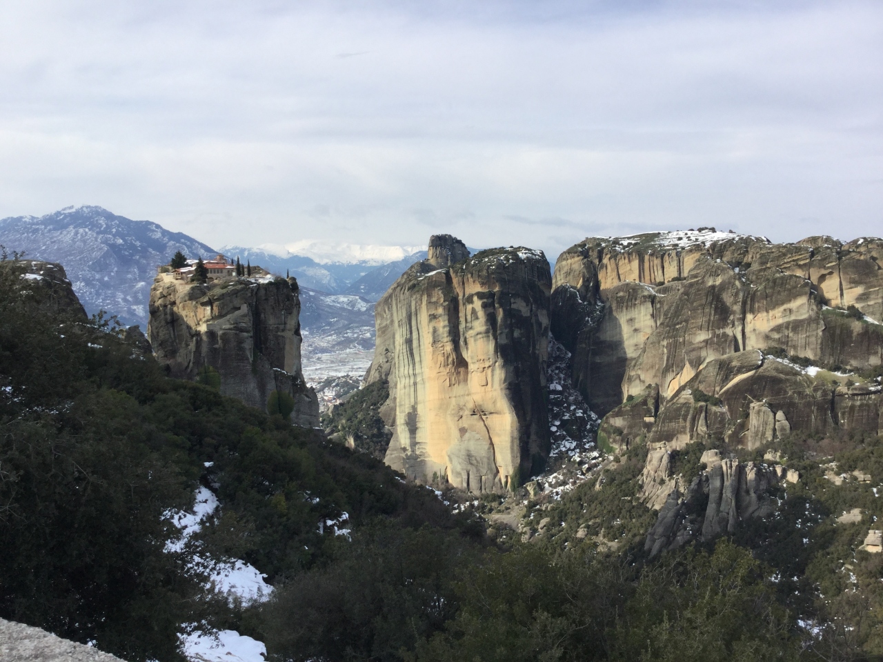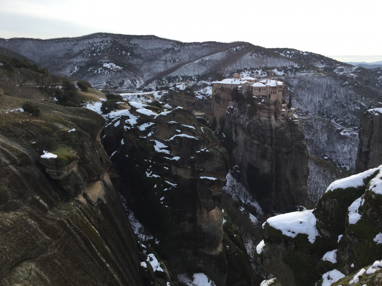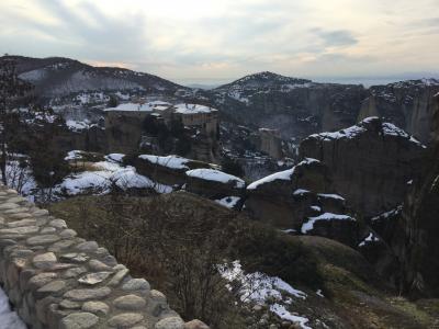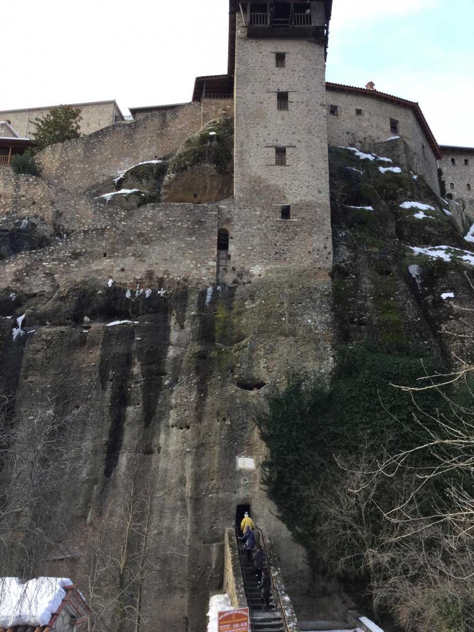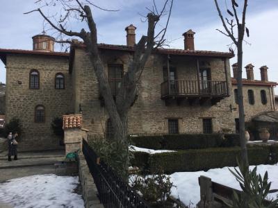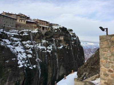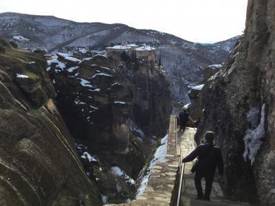 メガロ メテオロン修道院 (メタモルフォシス修道院)は冬季(火水が休み)も9時から開いており、613mの岩山にある最大の修道院に115段の階段を昇って入ります。