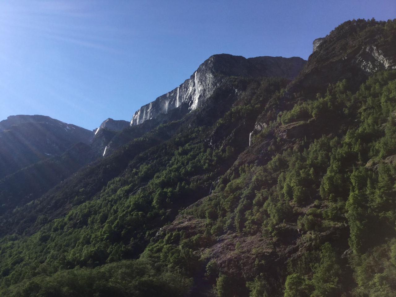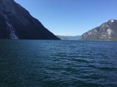 フロム港から、ソグネフィヨルドの内陸部の小さい長さ20㎞のアウルランフィヨルドを進んで行きます。