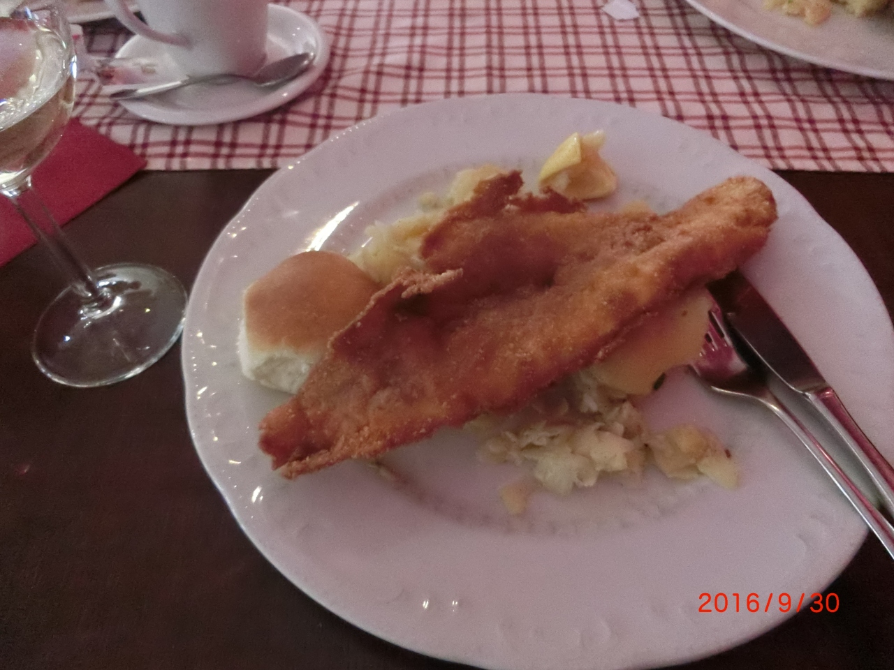 アレグリアの食事は鱈のフライです。大きく美味しい。