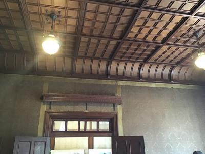 2階から別館への階段を降りると食堂に出る。天井には幾何学模様のパネル。- 旅行時期