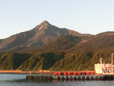 前は鴛泊港で早朝には昆布干し、その上に聳える朝焼けの利尻富士、