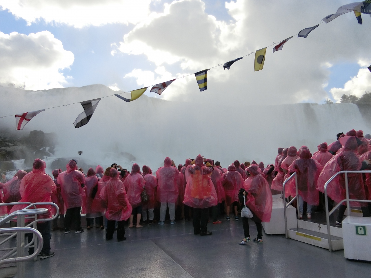 何百人かの大勢が赤いカッパを着て、飛沫を浴びながら、滝を見る。