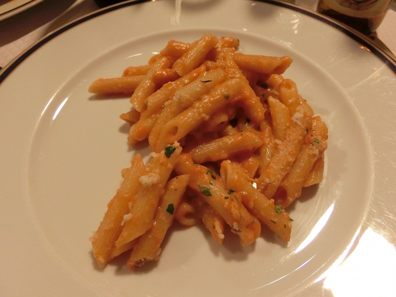ディナー料理は、ペンネ、サラダ、スライス豚肉ですが