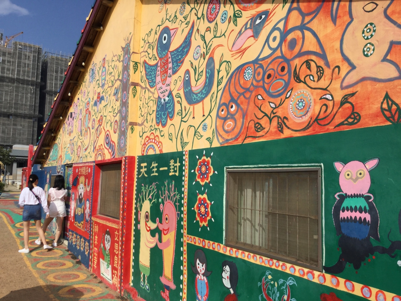 家の壁一面に色鮮やかな動物や人が描かれている昔の集合住宅です。