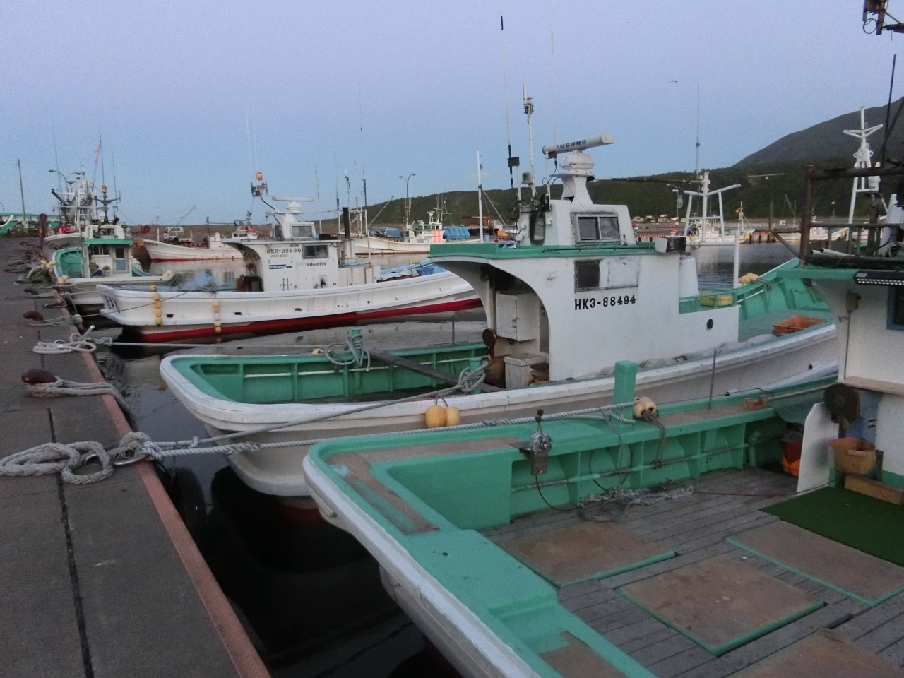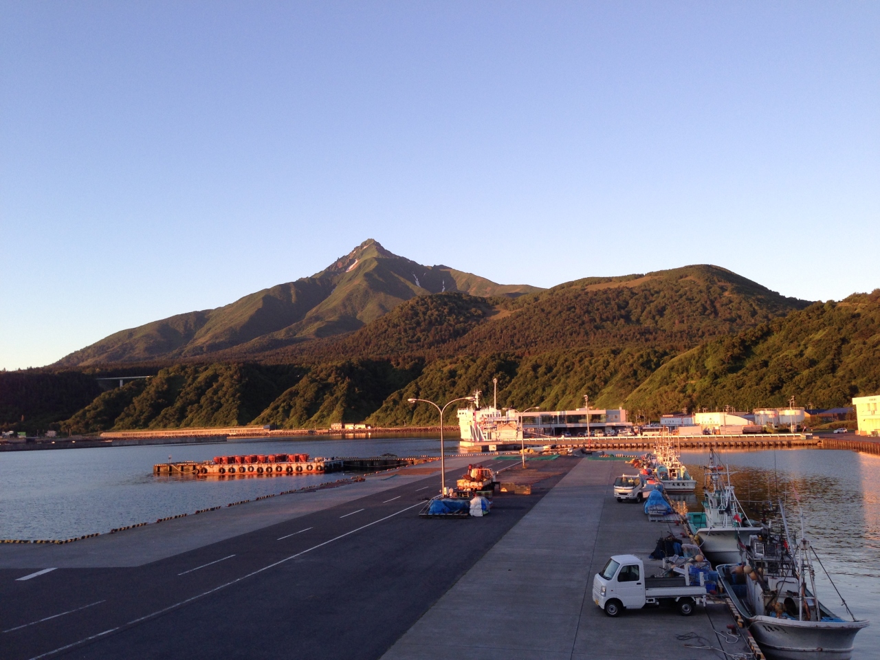 前は鴛泊港で早朝には昆布干し、その上に聳える朝焼けの利尻富士、