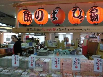 駐車場にある店、小島商店で、輪島名物の塩入りと蓬入りの2種類があり、
