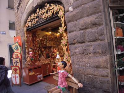 街並みがいいと聞いていたが、ドゥオモとシニョーリ広場の間の狭い路地は、結構魅力的だったが、トルナヴォーニ通りの貴族の館は、よく分からず。淋しい通りだった。ドゥオモからレストランに行く途中にピノキオの店があって、一際目を引いていた。