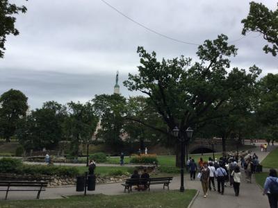 花壇があり人も観光客が歩いて先っぽが見えている自由記念碑を見に向かっています。- 旅行時期