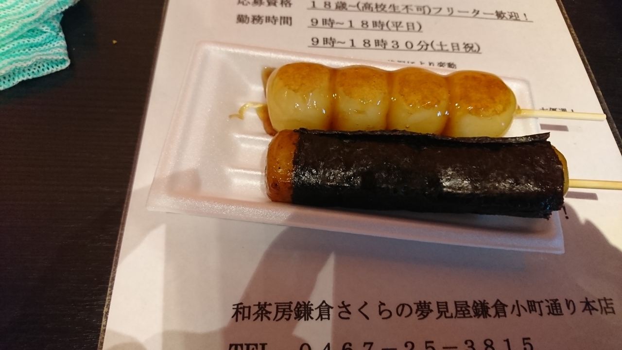 いそべ焼き160円、普通のみたらし団子120円、黒ごまなど、だいたいが130円、150円くらい。気軽に食べ歩きにはいいと思います。- 旅行時期