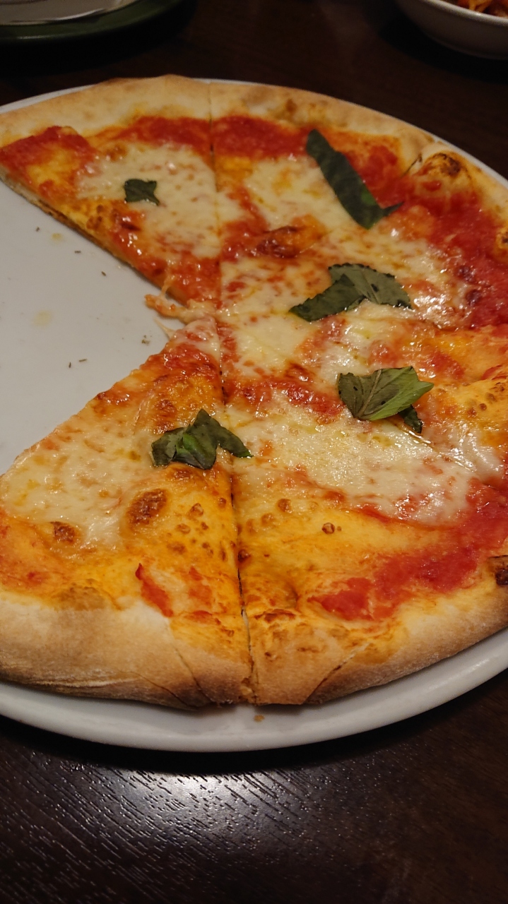 家族三人で、パスタ取り分けひとつ、マルゲリータ一枚、小さいパスタひとつ、サラダをいただいて、量的にちょうど良かったです。