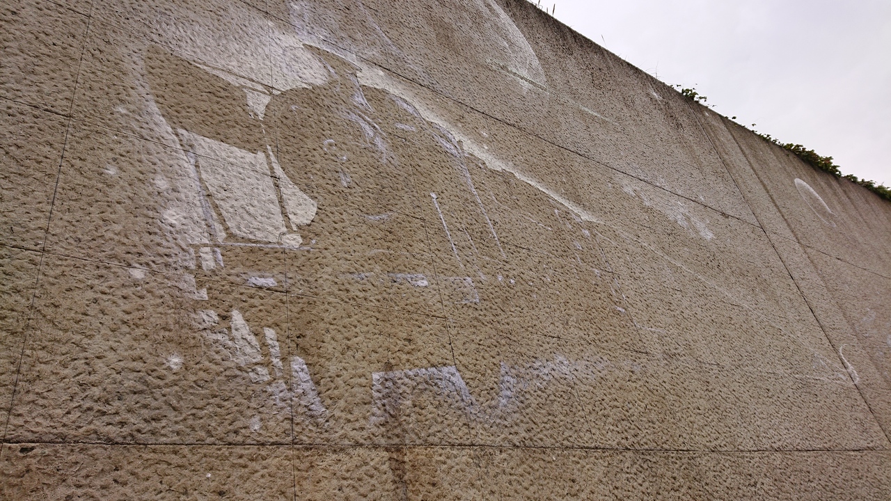 蛍光塗料を使って書かれているから、昼間見ても、遠くからならただの壁です。