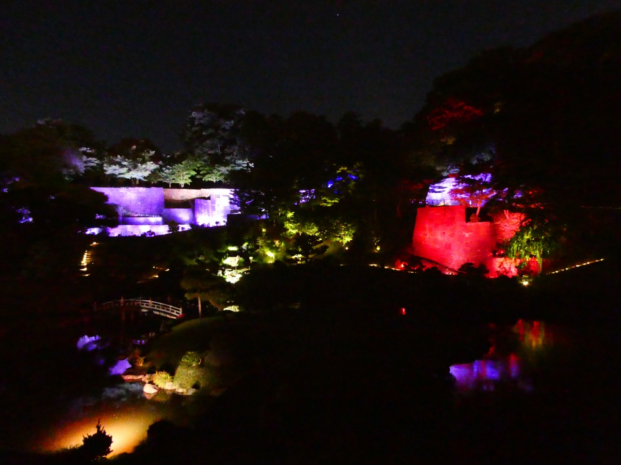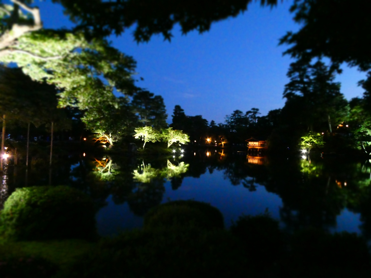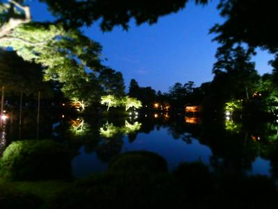 金沢城公園内にある庭園。夜のライトアップされたときに訪問しました。玉泉院丸庭園は音楽に合わせてイルミネーションが変化していました。あまりのきれいさに、立ち止まってついつい見入ってしまいました。翌日、昼間に訪問したところ、新緑がきれいな庭で心が洗われました。