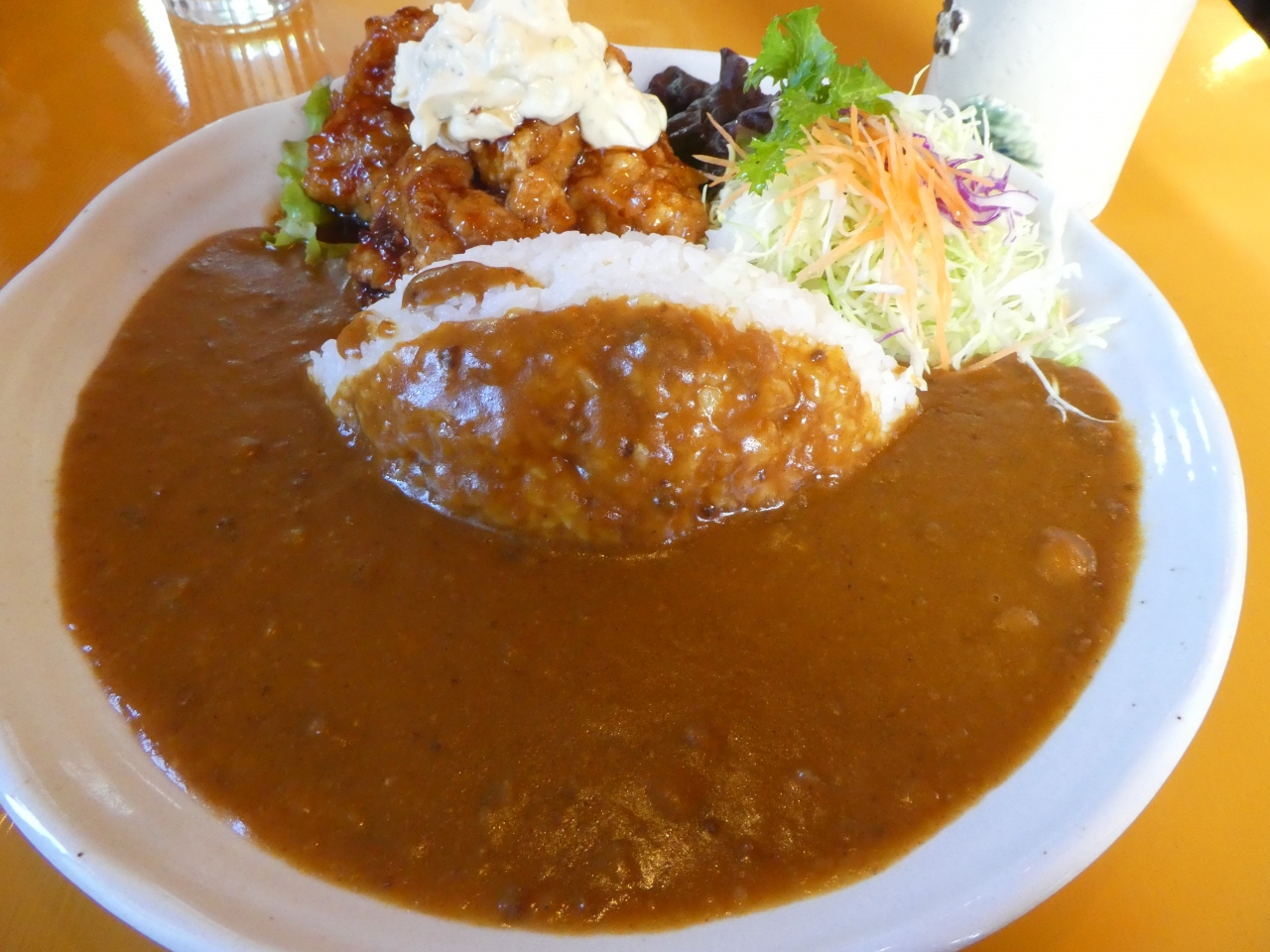 都城市役所のグルメ紹介ページに、都城市の名物の1つにチキン南蛮カレーがあると知り、この店を訪問しました。カレーにトッピングされたチキン南蛮は甘辛く、タルタルソースもたっぷりとかかっています。カレーは程よい辛さでとてもおいしく、チキン南蛮との相性もばっちりです。テーブルにセットされているカレー専用の醤油をかけると、和風な味に変わります。とてもおいしかったです。