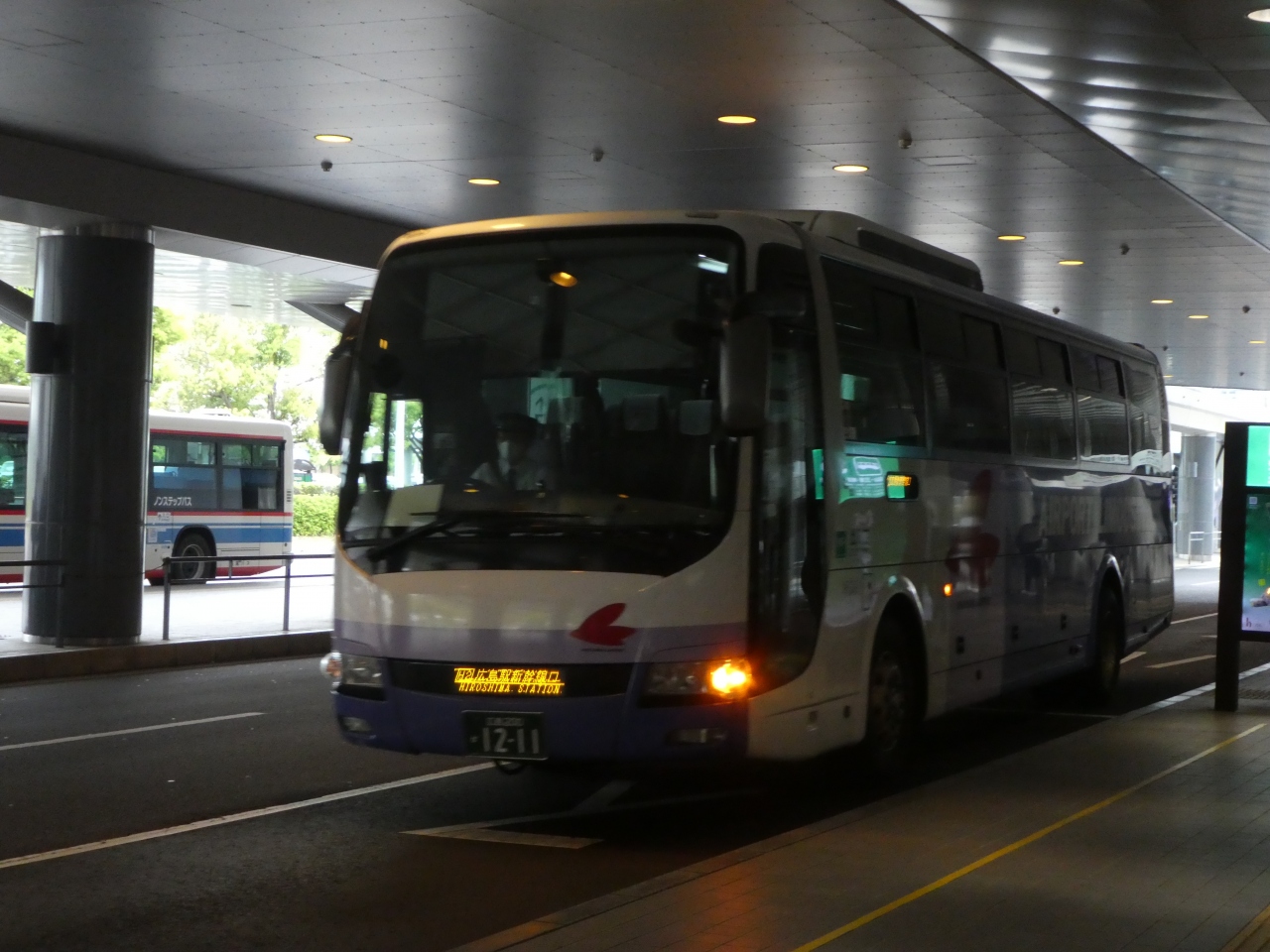 広島空港から広島駅を結ぶバス。広島空港と広島駅はかなり離れていて、バスで50分かかります。料金は片道で1,370円、往復で購入すると2,480円とちょっと安くなります。交通系ICカードも利用できるようです。私は広島空港8:50発に乗ろうと思いましたが、満員で乗れず、その直後の8:55発に乗車しました。わずか5分の違いですが、こちらの便の方が乗客が少なく、ゆったりと乗れましたので、特に不満はありませんでした。