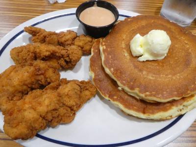 プレミアムアウトレットサウスの駐車場の敷地内にある、パンケーキが中心のファミレス。アメリカの子供はアイホップが大好きのようで、私が行った時も家族連れが多かったです。パンケーキにかけるシロップはテーブル上に4種類備え付けられていて、お好みの味を選ぶことができます。味は見た目そのままでした。