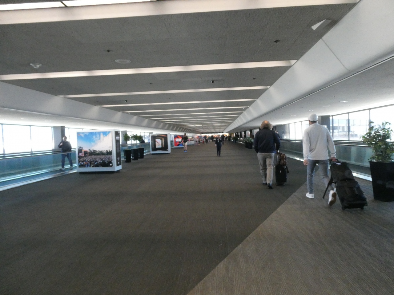 国際線でSFOに到着して国内線に乗り継ぐ際は、入国審査を済ませた後、預け入れ荷物を一度ピックアップし、またすぐに預けます。出口ではなく乗り継ぎの案内に沿って進むと、国際線からの乗り継ぎ客のための通路を利用して、ターミナル間を歩いて移動することができます。そうすることで、国内線搭乗時の保安検査をスキップすることができます。ただし、20分くらいは徒歩移動となるので、歩くのが億劫だったりしんどかったりする方は、一度外に出て循環シャトルに乗って移動することもできると思います。その場合は、国内線搭乗時に再度保安検査を受ける必要があります。乗り継ぎの際はこのルートが便利だと思います。
