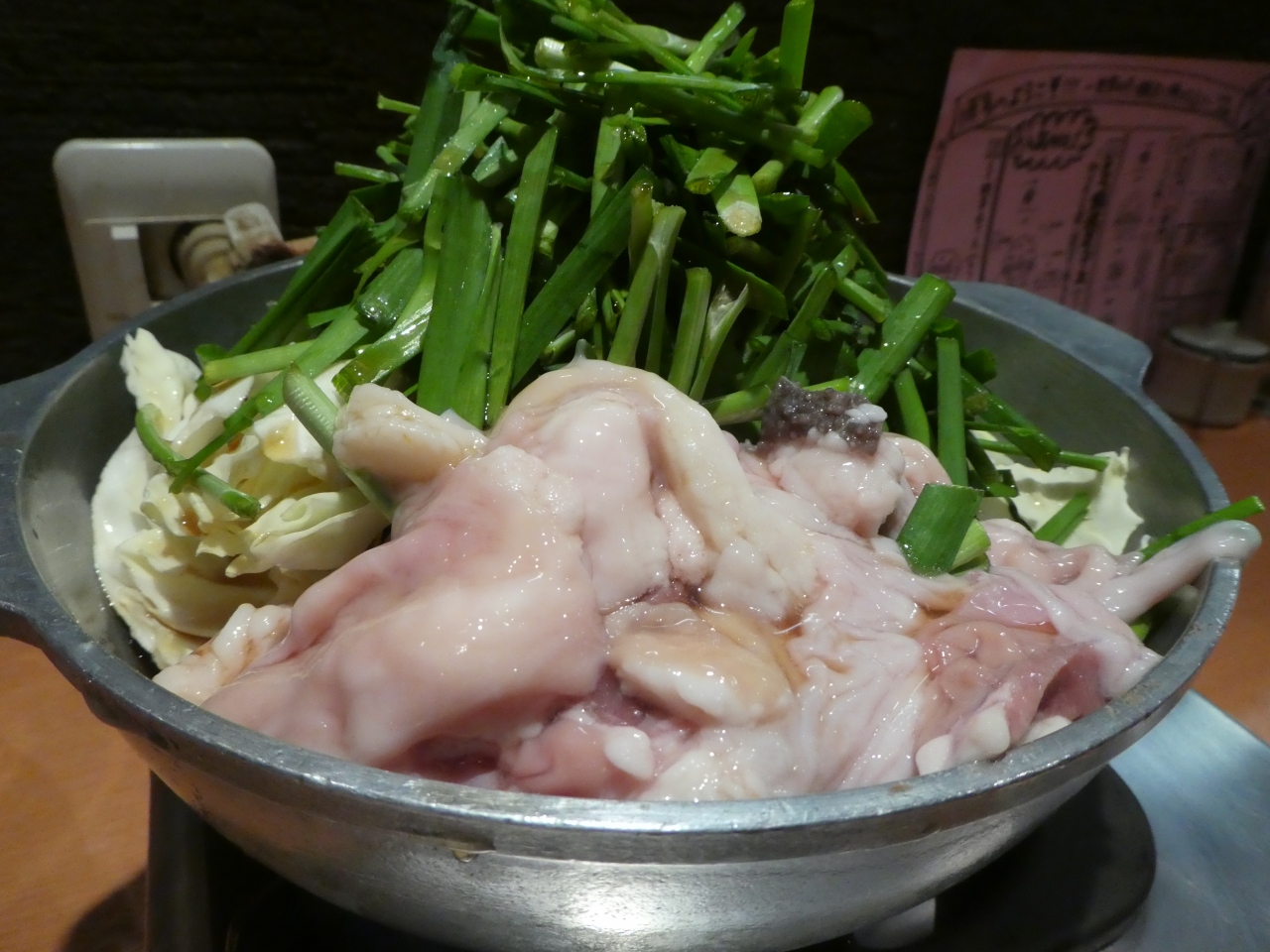 博多駅そばのもつ鍋屋さん。店頭には「一人前900円」「飲んで食べて2000円くらい」と書かれていますが、実際にはその倍くらいかかりました。もつ鍋はニラが山盛りで提供されます。もつもとても美味しいです。〆のちゃんぽんも含めて、満足な鍋でした。
