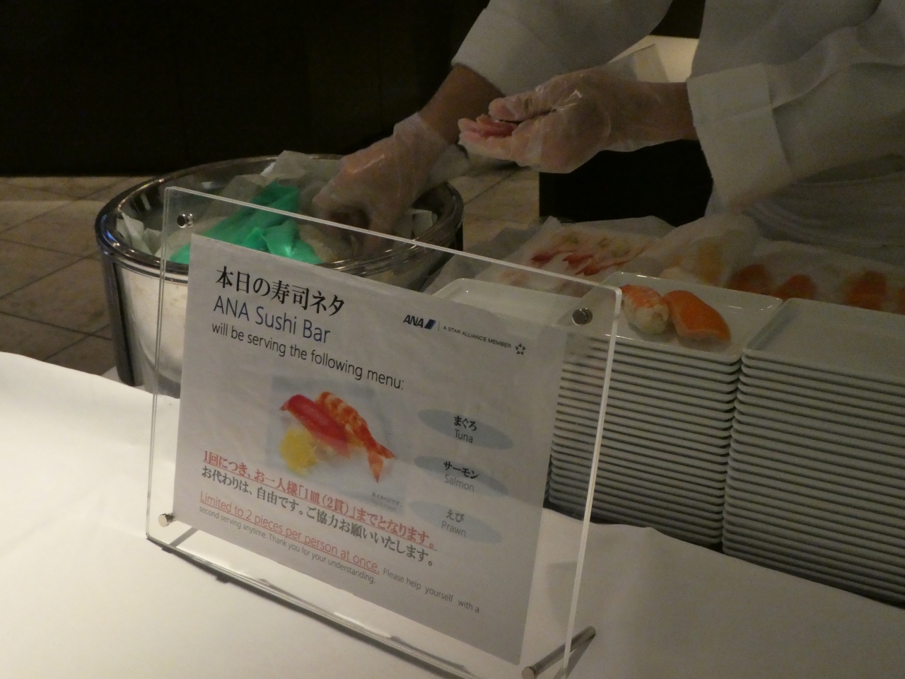 前回利用したときにも遭遇しましたが、今回も握り寿司のサービスをやってました。ねたはマグロ、サーモン、エビの3種類。そのうち好きな2貫を注文できます。行列ができるので、1回の注文につき1人2貫までですが、何度も列に並ぶことは可能です。ほっぺたが落ちるほどおいしいという訳でもないですが、心のこもったサービスだなぁと思いました。