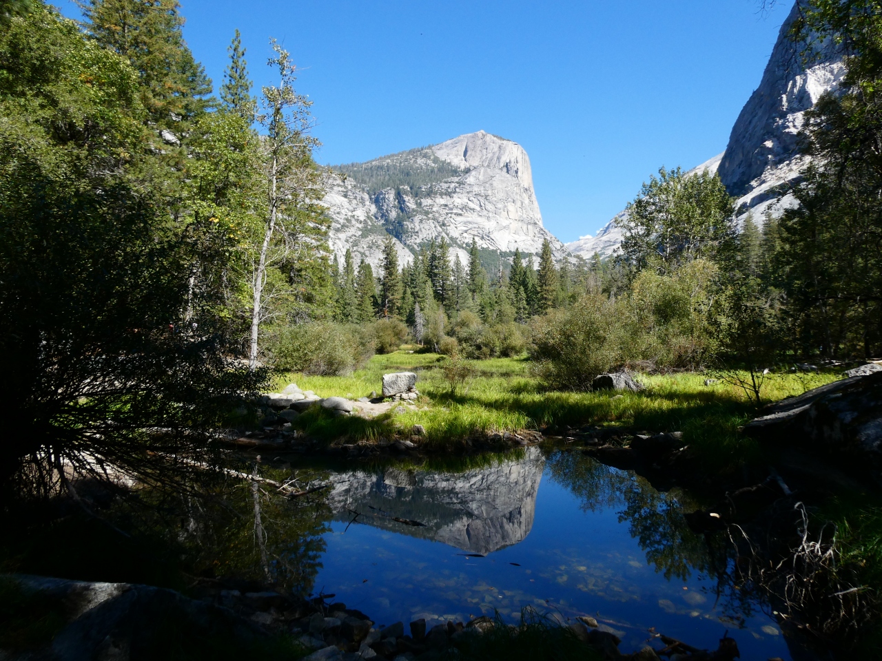 最寄りの駐車場からミラーレイクまでは舗装された道路を歩いていくことになります。最寄りの駐車場からは徒歩で30分くらい、ヨセミテバレー付近から歩いたとしても1時間くらいで到着すると思います。私が訪問した10月は、夏も終わりで雪解け水の水量も減ってきていたせいか、湖の水は想像よりも少なかったです。それでも、湖面に反射する白い岩山と青い空は、とても美しかったです。