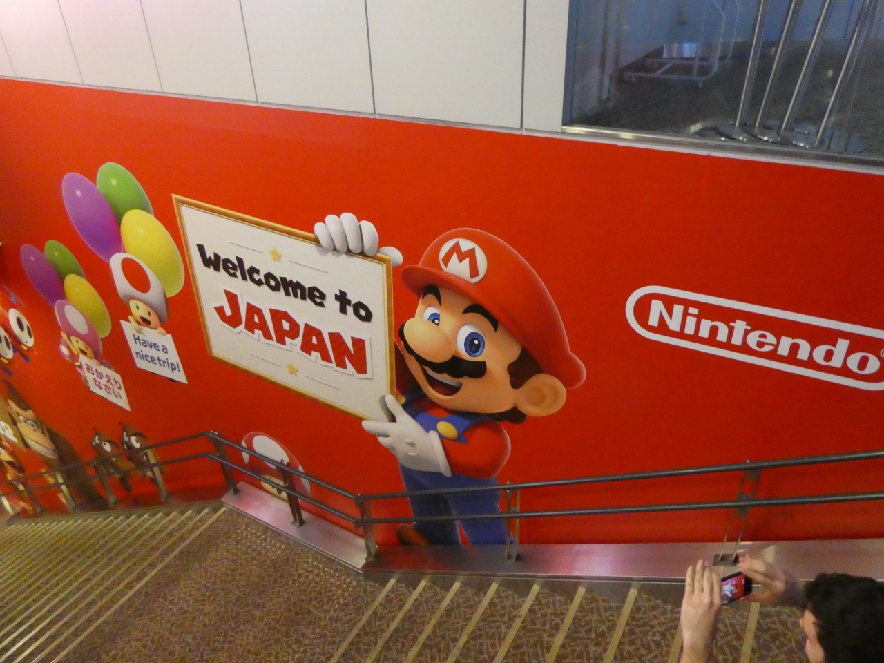 外国人旅行客が多く訪れる羽田国際空港。飛行機を降り、バゲッジクレームに向かうエスカレータの壁には、クールジャパンの象徴ともいうべきスーパーマリオブラザーズのキャラクターが描かれていました。これを見ると、旅行客の気分も上がると思います。