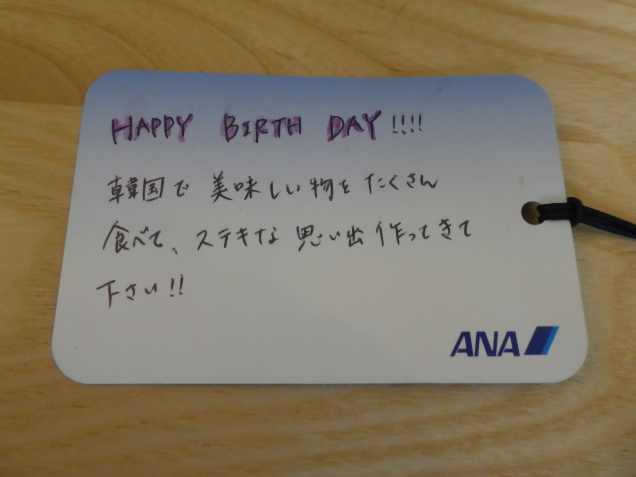 ソウル発券の別航空会社のチケットを購入し、ソウルに往復する必要が生じたので、貯まったマイルでソウルに行きました。ちょうど誕生日だったのですが、チェックイン時にそのことをグランドスタッフさんと雑談の中で話していたら、「HAPPY BIRTHDAY」というタグをつけてくれました。ちょっとした心遣いが嬉しかったです。