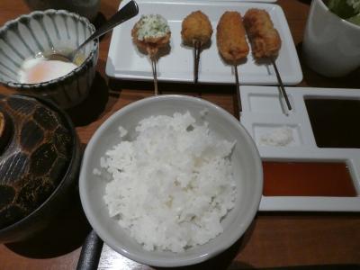羽田空港国際線ターミナル内にあるレストラン。内装は落ち着いたモダンジャパニーズな感じです。この時は串7本のサービスランチを注文。ごはんとお味噌汁はお代わり自由です。串は小ぶりで、揚げたてを食べられます。さくさくと軽い触感です。お昼過ぎの時間帯の利用でしたが、その時は女性の一人客が多かったです。