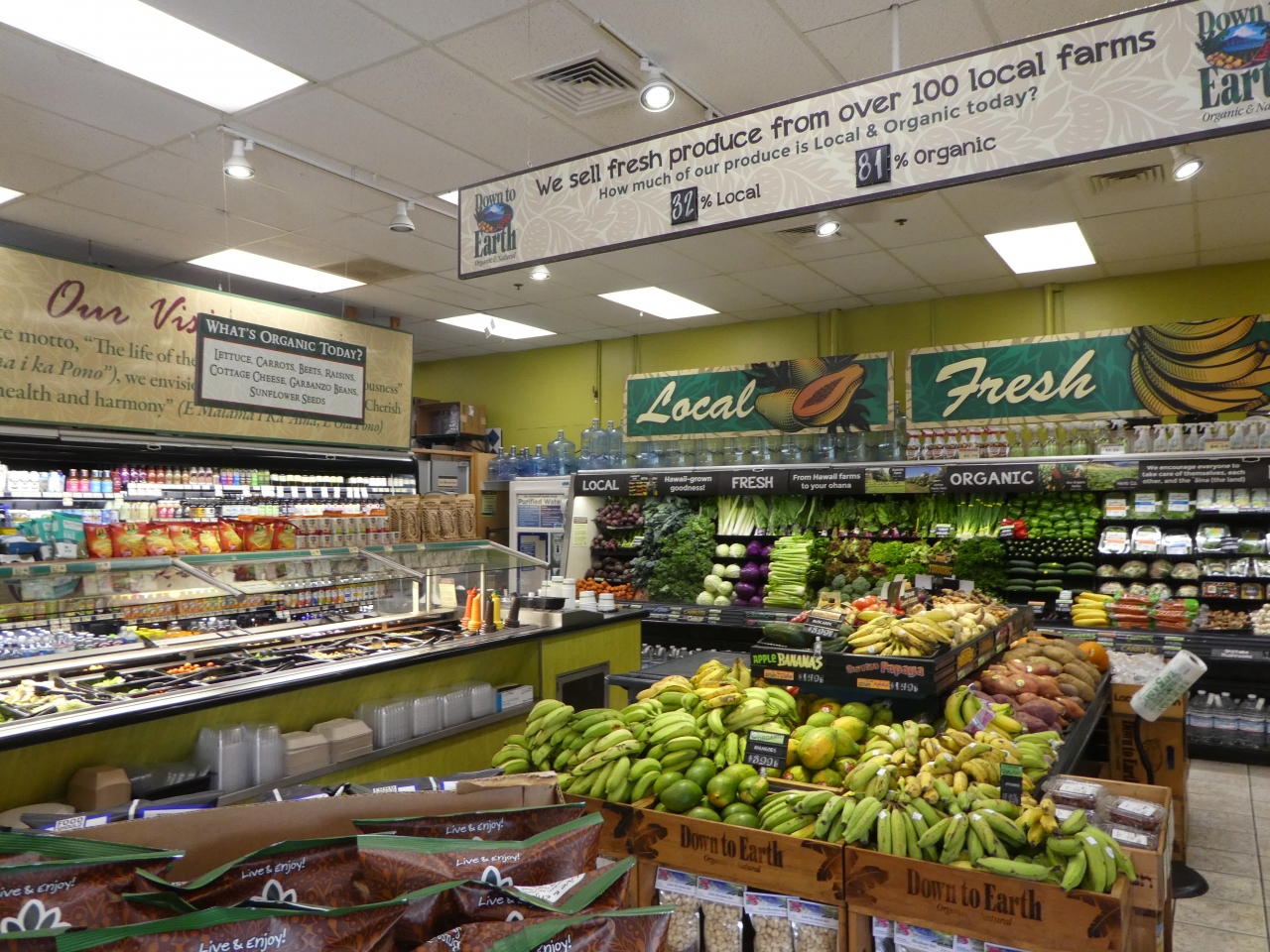 カイルア地区にあるスーパー。オーガニックな生鮮品の割合が多く、この日は生鮮品の81%がオーガニック、32%が地元産とのことでした。ただ、そんなに広いお店ではないです。その場でトロピカルジュースやコーヒーなどの販売も行っていました。少し狭いホールフーズ、という感じでした。