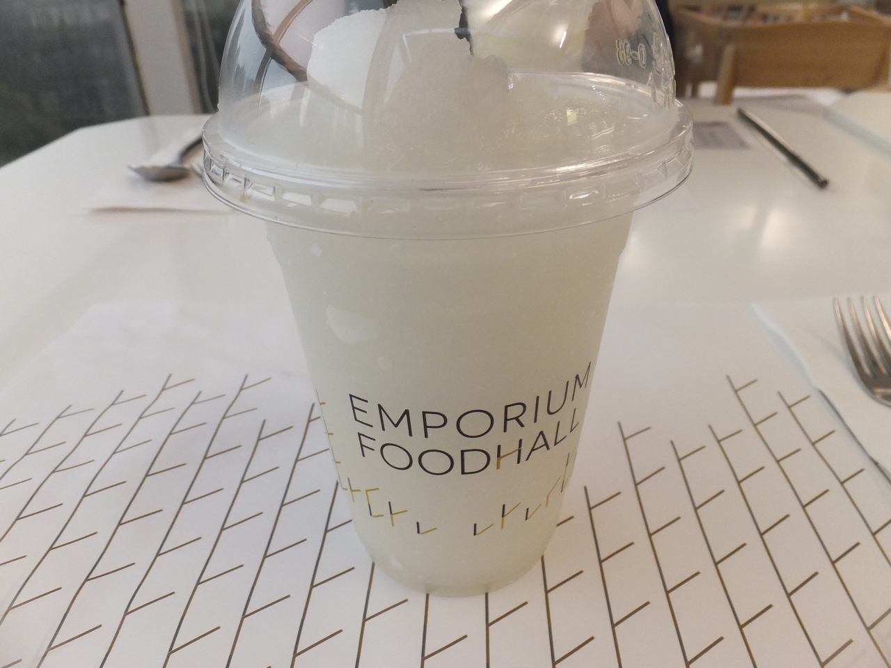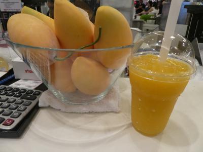 グルメマーケットはバンコク市街に何店舗かあり、どこも品揃えが充実していて楽しいです。この日はバーゲンと重なっていたこともあり、店内はかなり混雑していました。99バーツでマンゴスムージーをその場で作ってくれるエリアがあり、そこでスムージーを注文しました。マンゴーに蜂蜜を入れていたのがポイントかも。美味しかったです。