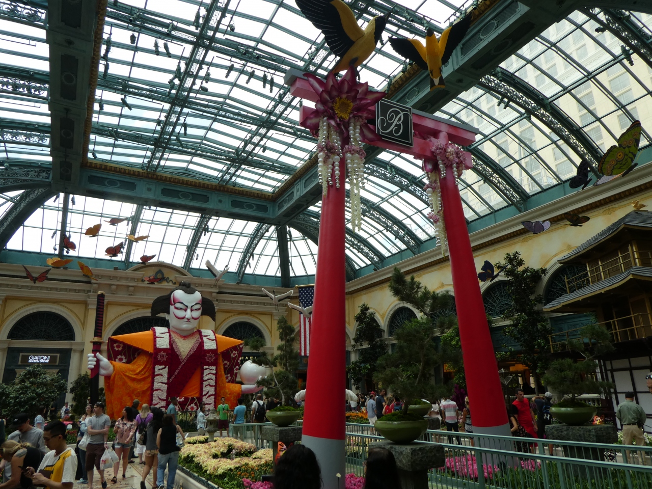季節ごとにテーマが変わるボタニカルガーデン。今年のゴールデンウィークの時期は、ゴールデンウィークを意識したかどうかは分かりませんが、歌舞伎や鳥居など、日本がテーマでした。生花や鳥など、生命力を感じる展示には、毎回心打たれます。これを無料で開放するベラージオの心の広さもステキです。