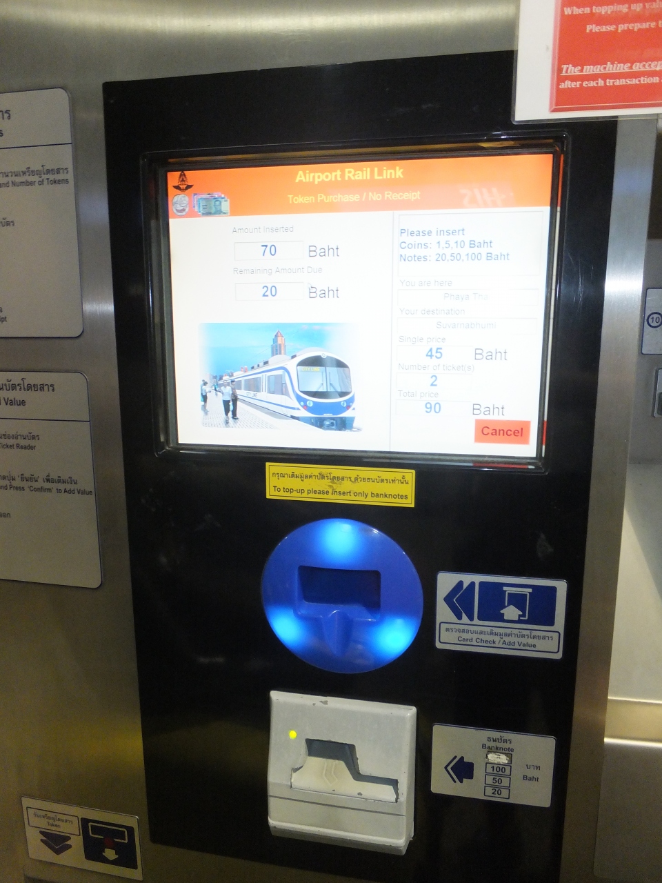 スワンナプーム国際空港から市街地までの移動手段はいくつかあると思いますが、慢性的な渋滞が続くバンコクでは、エアポートレールリンクが一番早いと思います。開通当時はエクスプレス線があったようですが、今はないようです。どうやら、採算が取れなかったらしいです。私はパヤタイ駅まで乗り、そこからBTSに乗り換えましたが、駅と駅の距離がそこそこあり、案内はあまりなく、乗り換えは多少面倒に感じました。