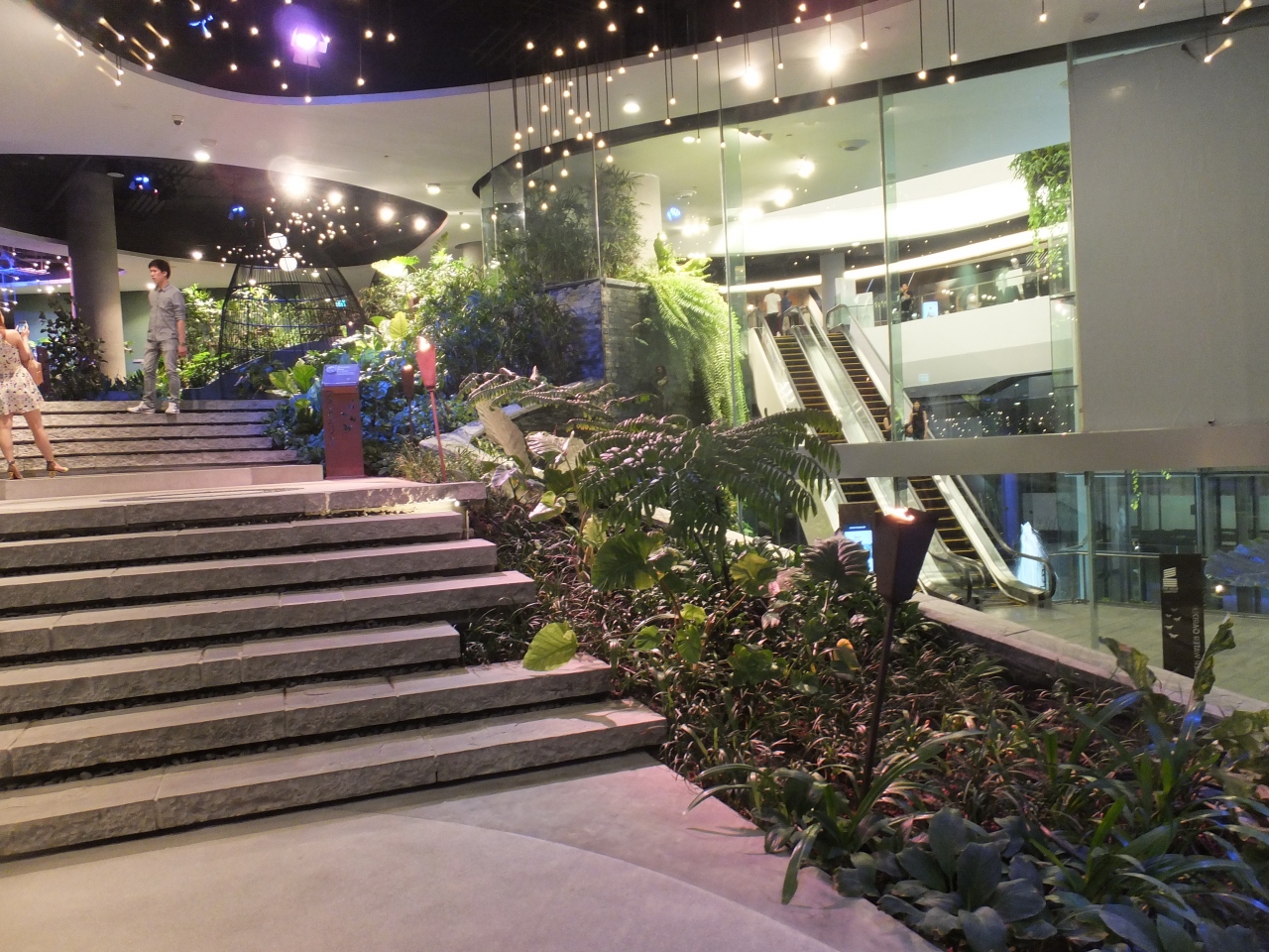 駅の両側にショッピング施設に直結していて、買い物するのに便利です。このあたりは駐在日本人が多く、日本語の看板も多く見かけます。治安も、悪いとは感じませんでした。改札のすぐそばで、3Dライドみたいなアミューズメント設備が稼働していました。時間がなくて乗りませんでしたが、乗ってみたら楽しかったかもしれません。